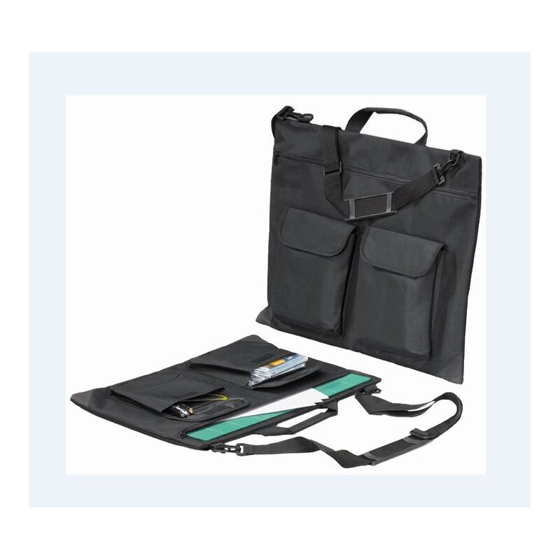 Zeichenplattentasche A3 aus leichtem, strapazierfähigem Polyester, mit mehreren Innenfächern und zwei aufgesetzten Außentaschen. Separates Fach für Zeichenplatten zusätzlich gepolstert. Mit Tragegriff und Schulterriemen als Universaltasche einsetzbar. Farbe: schwarz. Außenmaße: 620 x 475 x 15 mm.